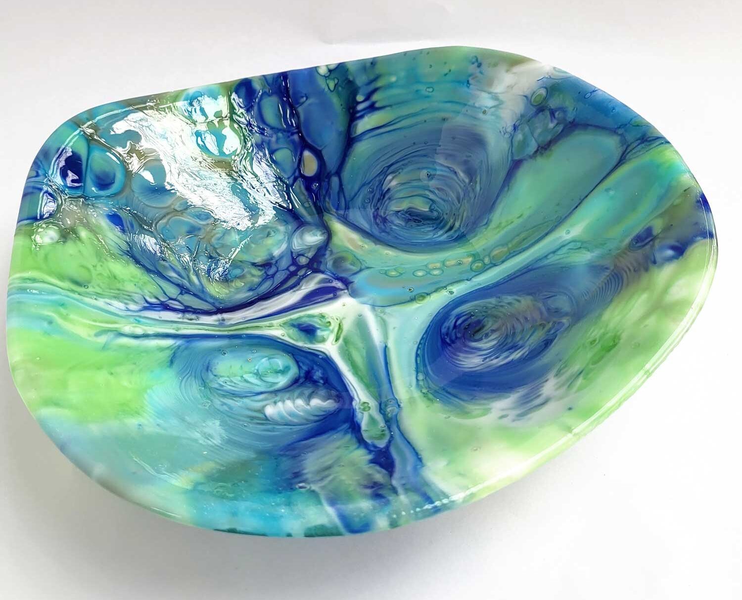 No two are exactly alike—this bowl features softly flowing, organic edges that give it a natural, sculpted feel. Made from colorful fired glass, it’s a piece that looks just as beautiful holding fruit or snacks as it does sitting out on display, catching the light in unexpected ways.