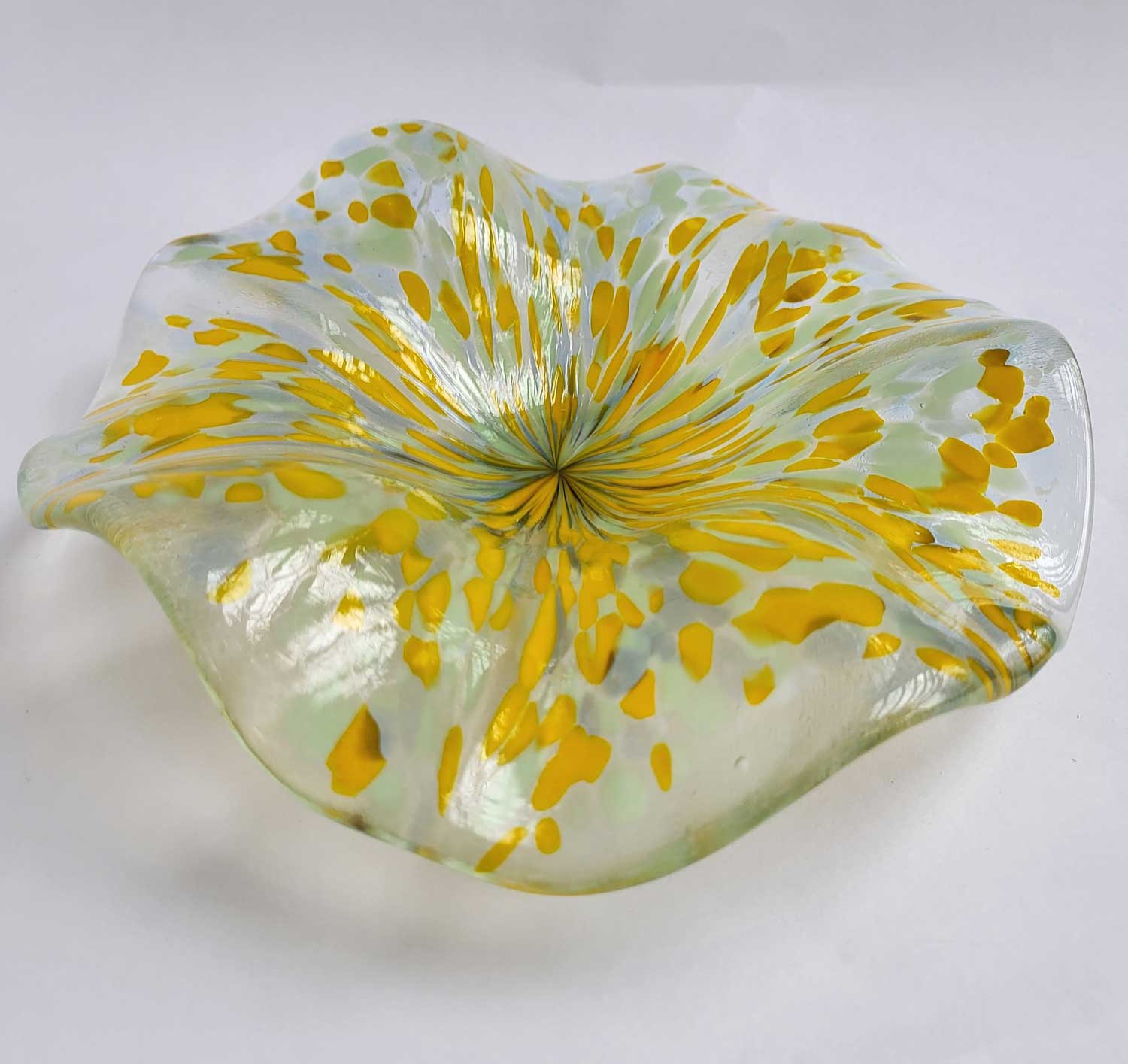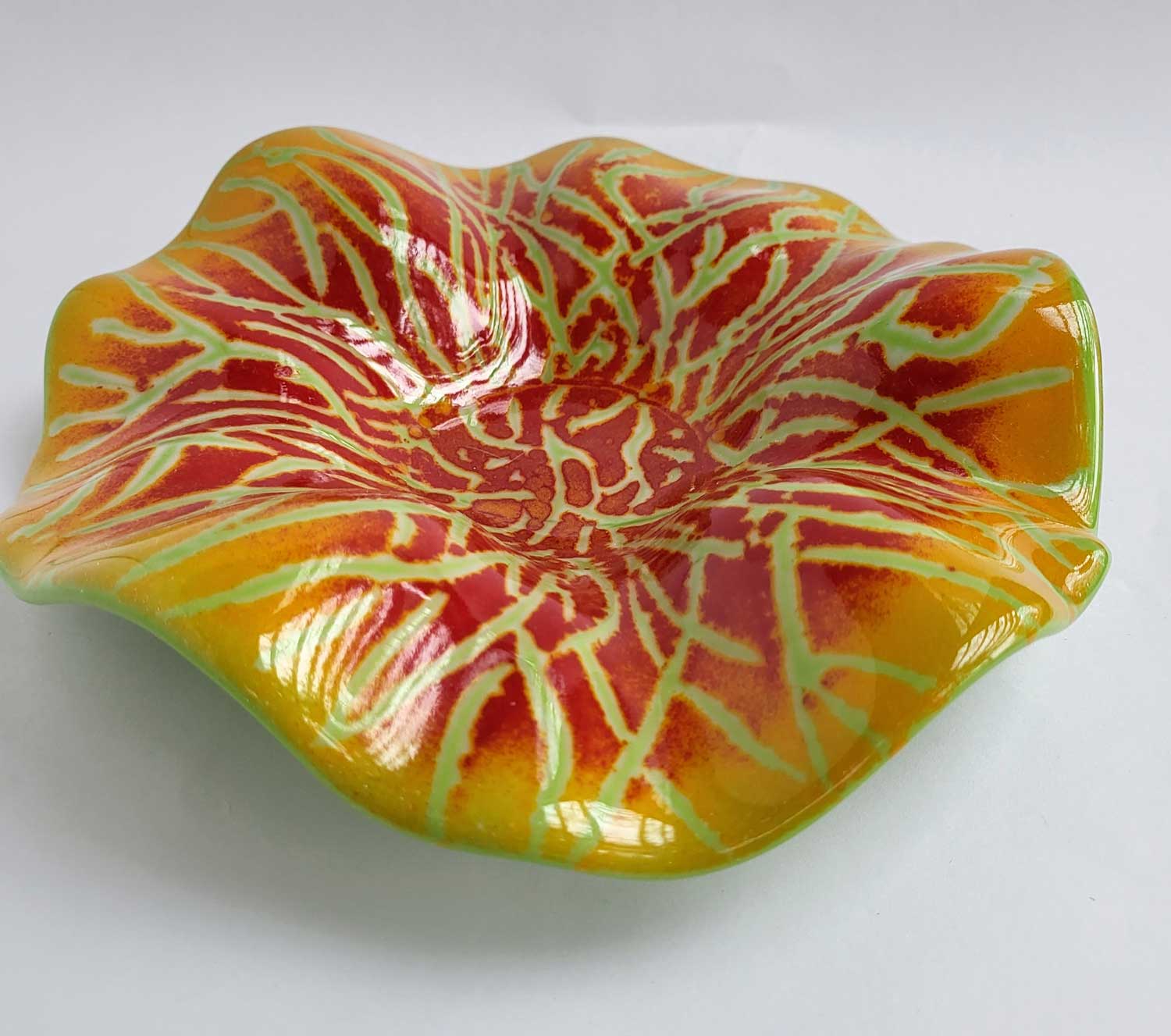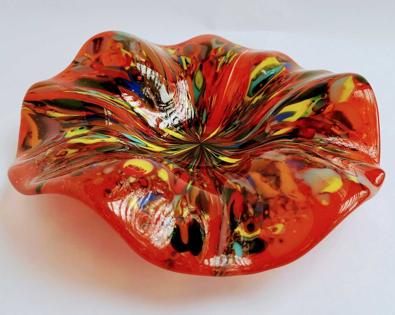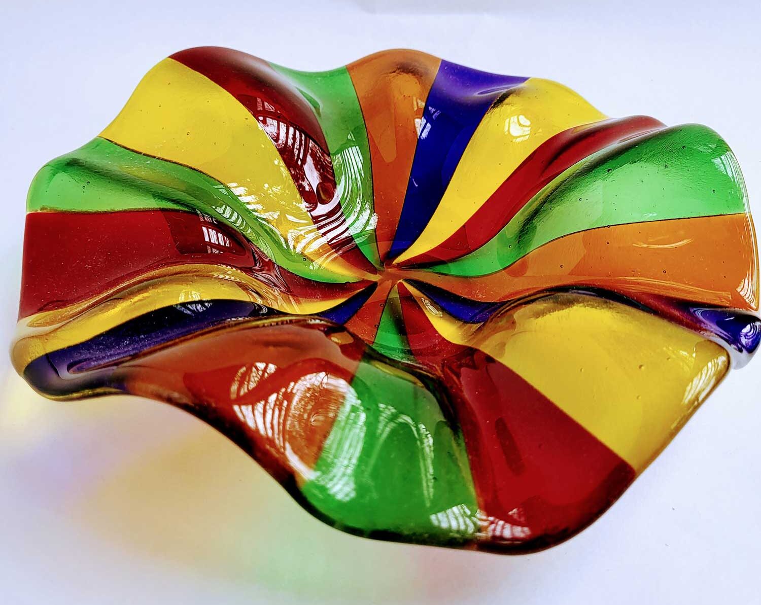 With edges that ripple like gentle waves, this shallow bowl is full of movement and color. Handmade from fired glass, it makes a lively centerpiece, a playful fruit bowl, or simply a joyful display piece that brightens up a room.